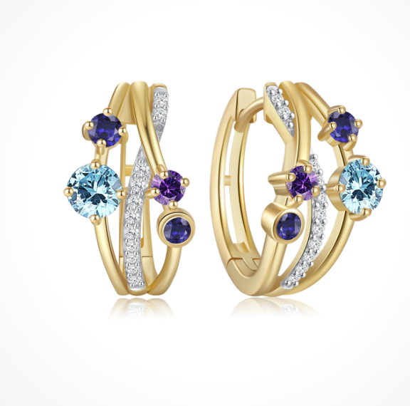 8 kt. guld ørestikker creol 3 streger med syntetiske cubic zirconia i safir/topas/london blå topas/ametyst og hvid i midten af streg.