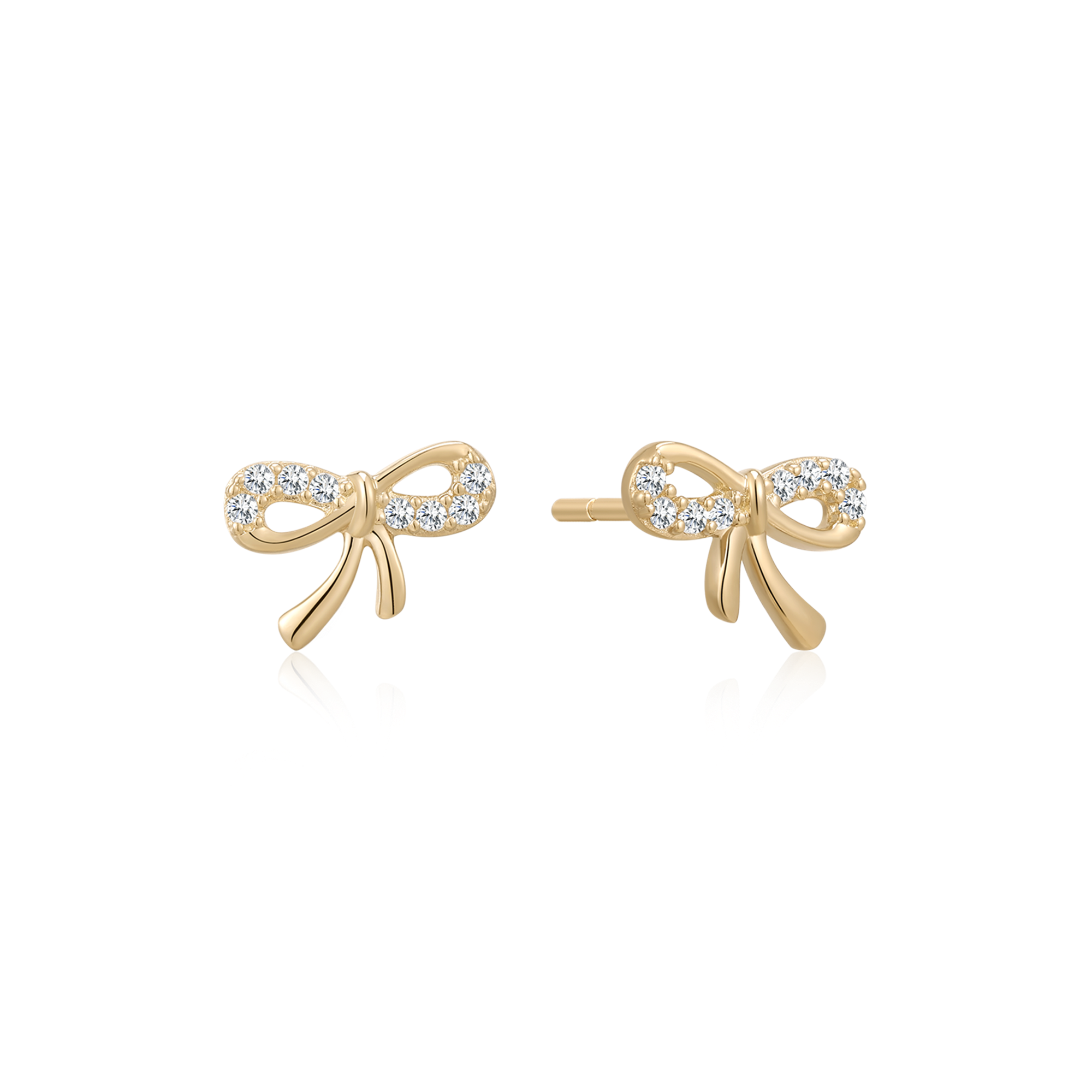 Guld ørestikker formet som sløjfer med skinnende sten og glatte, polerede detaljer.