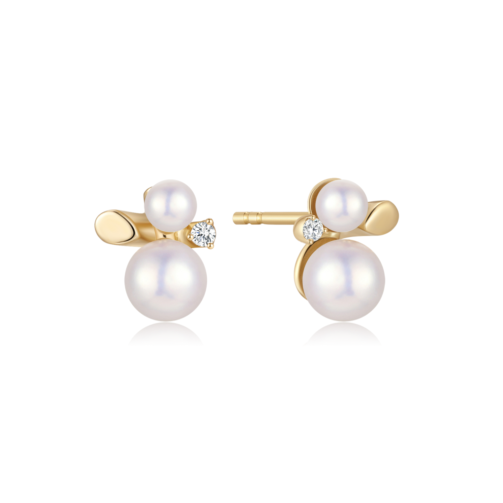 14 kt. guld ørestikker figur med perle og en brillant i den ene side og plade på den anden side.