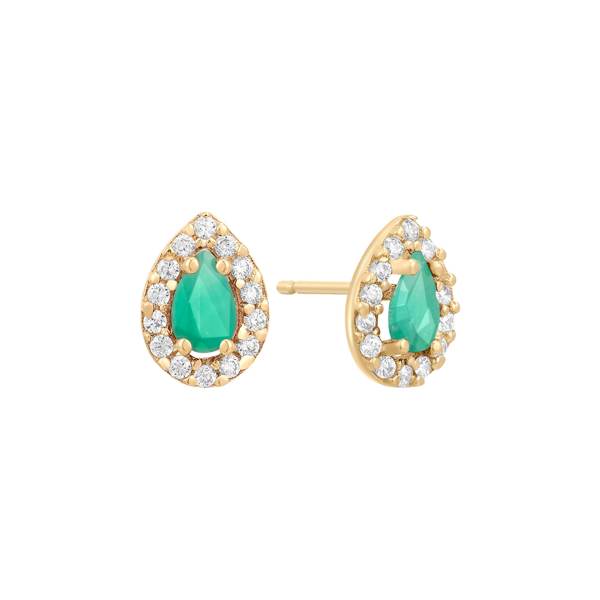 Dråbeformede ørestikker med grøn sten og klare sten i guldfarvet indfatning fra Støvring Design.