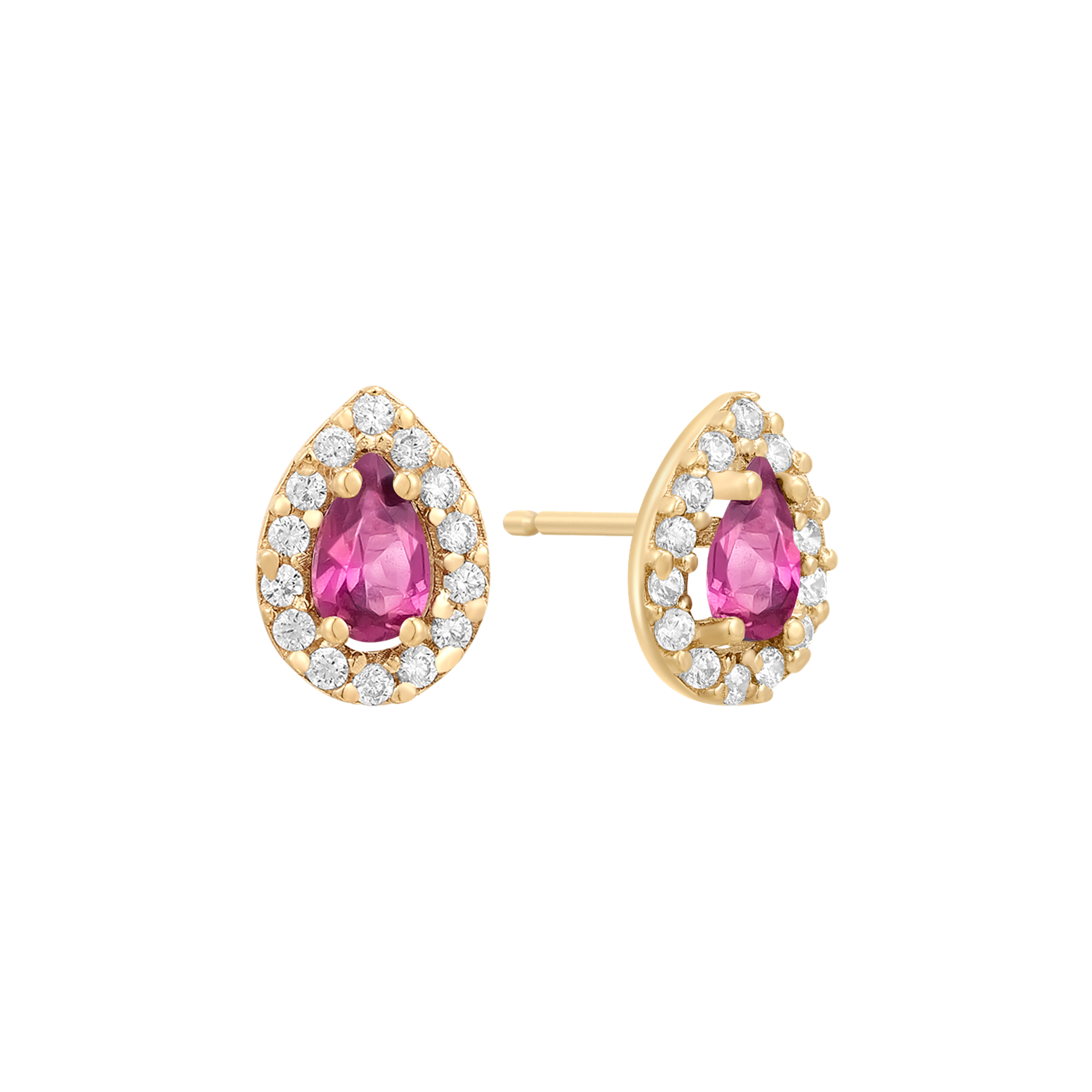 Dråbeformede ørestikker med central pink sten omgivet af klare sten, elegant og symmetrisk design.