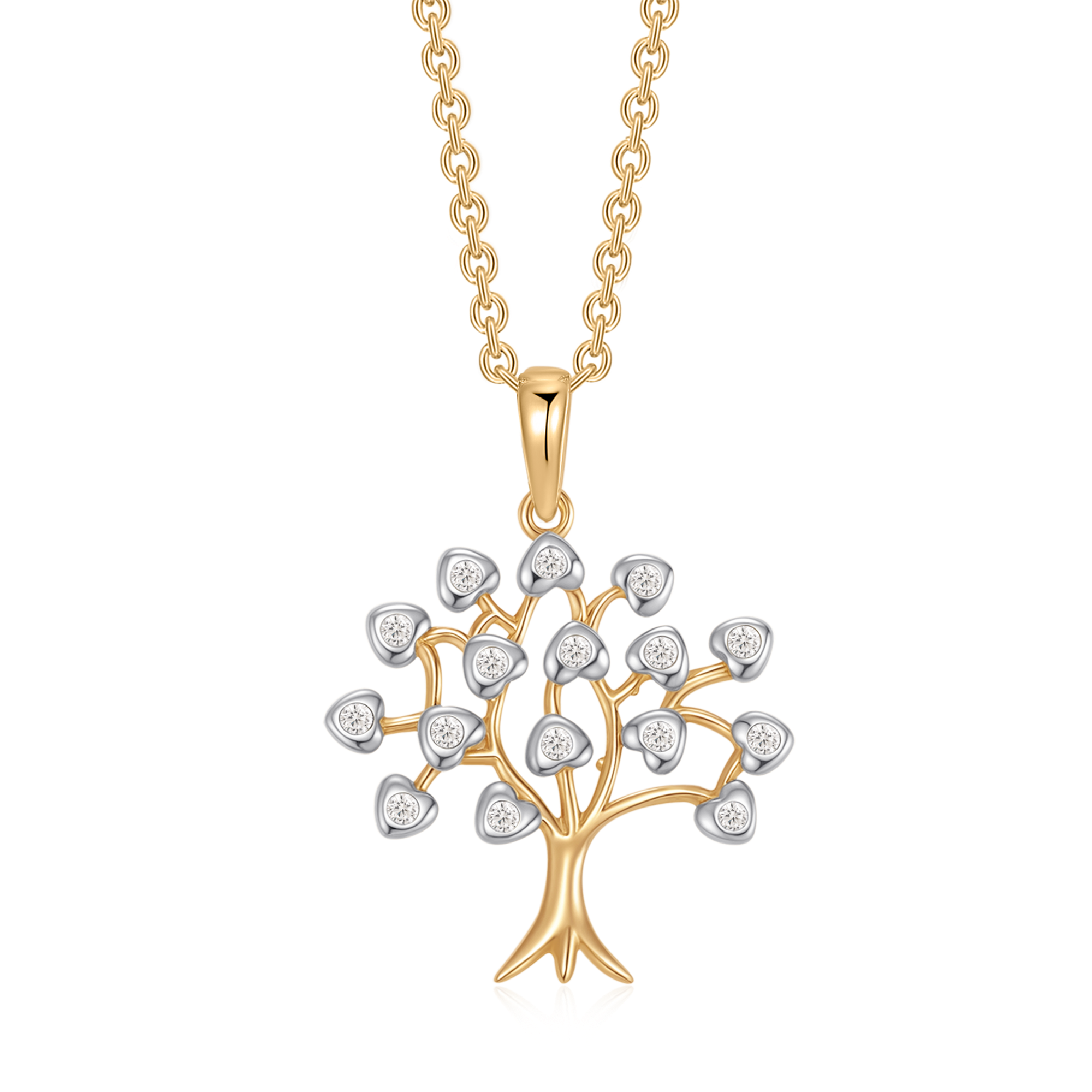 Guldfarvet vedhæng formet som et træ med hjerteblade og små sten, på rund kæde.