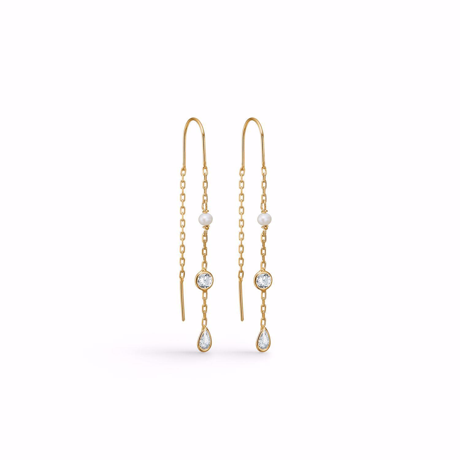 Smukke guld ørekæder med klare zirkonia sten og hvid perle.