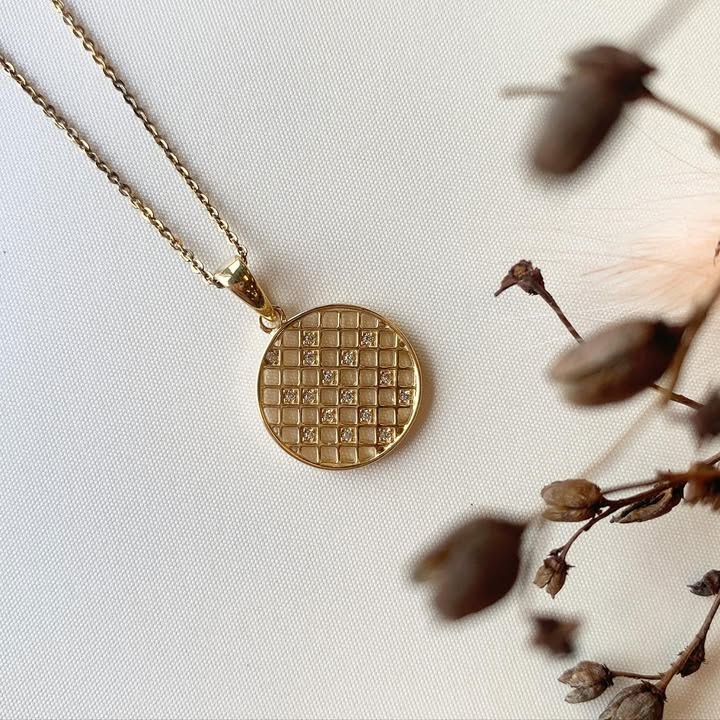 Smukt vedhæng i forgyldt sølv med net mønster og glimtende zirkonia