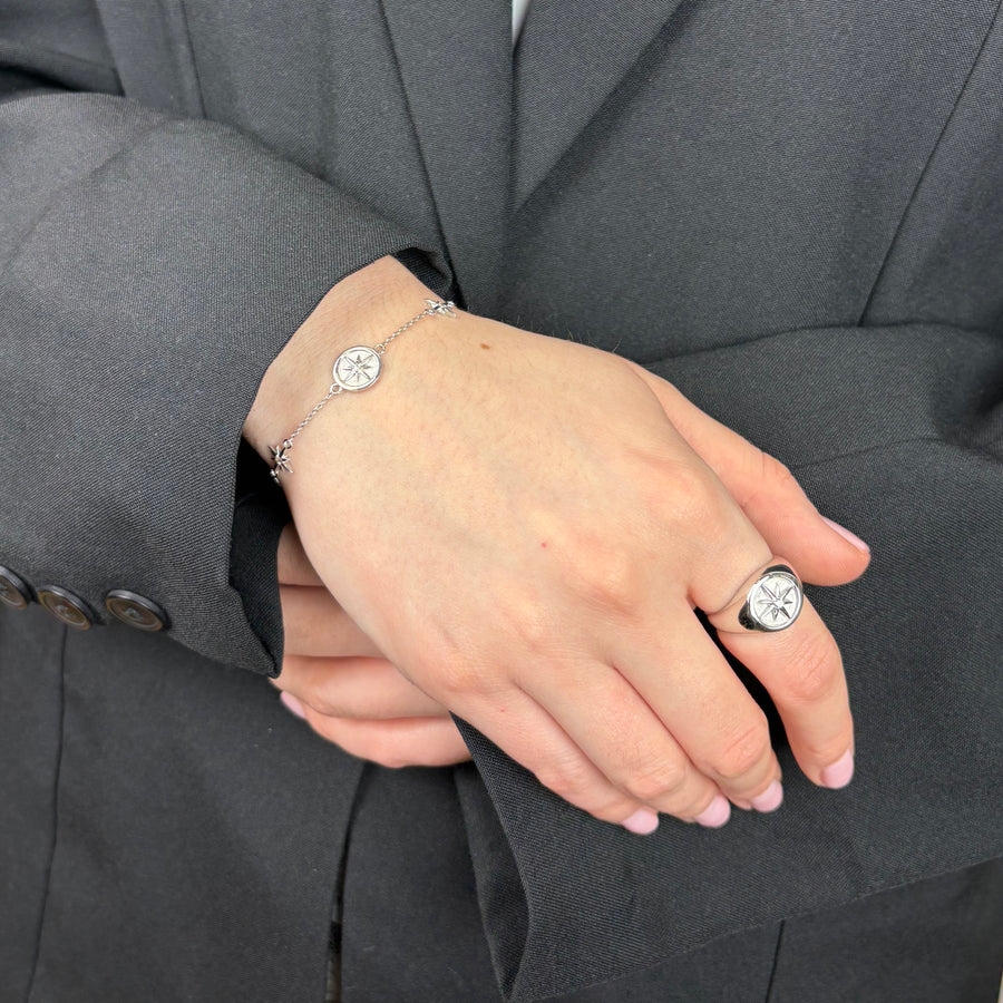 Signet fingerring i sterling sølv med stjerne og glimtende zirkonia. Til ringen finder du både vedhæng, ørestikker og armbånd - se herunder, Ø 13 mm i toppen