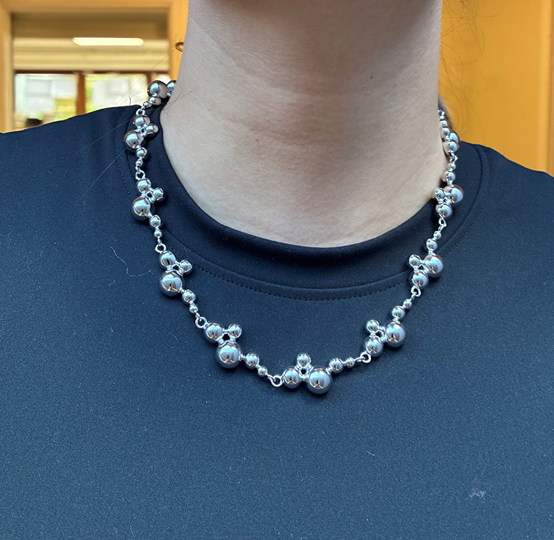 Halskæden er i 925 sterling sølv og består af flere størrelser kugler, der er sammensat i klynger af 5 kugler