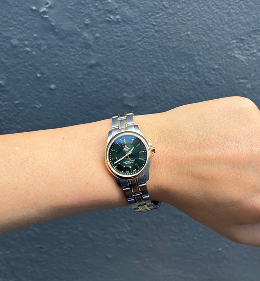 Funktioner et flot design med sunburst grøn skive og er på 28 mm. Uret har et super præcis urværk og er vandtæt til 100 meter, så du kan svømme med det. Uret har safirglas.