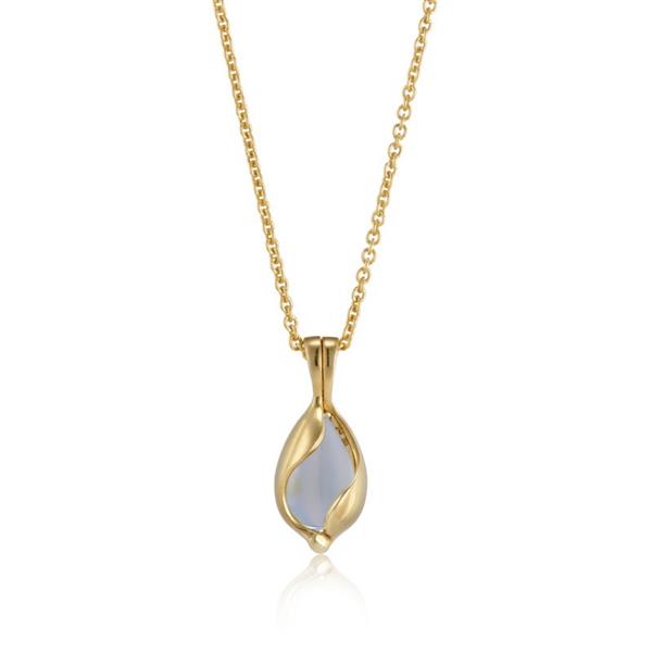 Halskæde i forgyldt sølv med blankpoleret fin overflade og grå-blå agat. Du kan selv skifte sten i halskæden. Grå-blå Agat: Stenen siges at styrke din selvtillid og intelligens. Den hjælper dig til at tænke hurtigt og klart. En sten der giver mod og handlekraft. Læs mere om de mange stens betydninger: KLIK HER