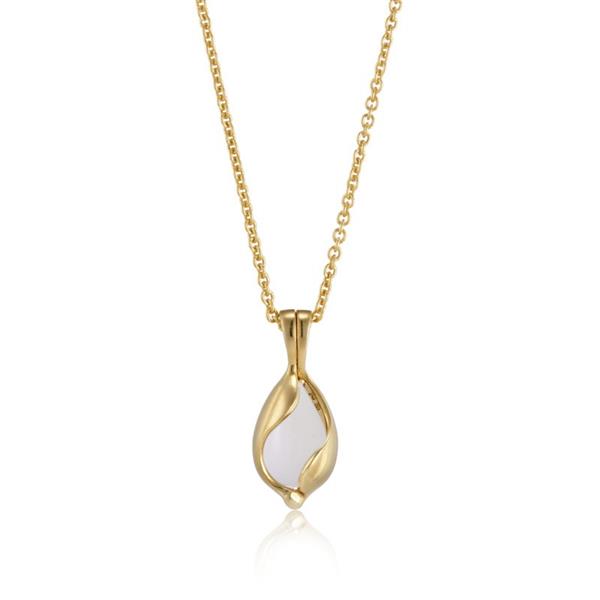Halskæde i forgyldt sølv med blank overflade og hvid agat. Du kan selv skifte sten i halskæden. Hvid Agat: Hjælper dig med at finde dig selv. Har du problemer med at rive dig løs fra familiens bånd, kan hvid agat anbefales. Stenen er generelt god til følelsesmæssig renselse og er samtidig en energiskabende sten. Læs mere om de mange stens betydninger: KLIK HER