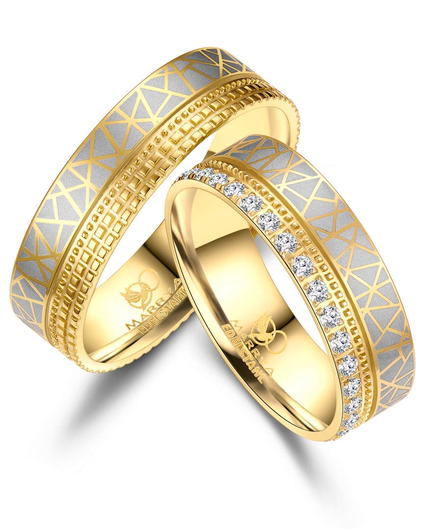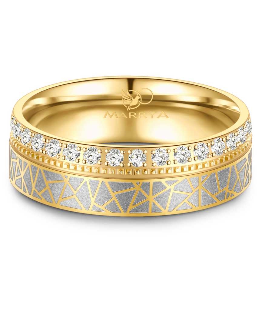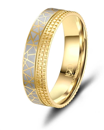 Et par 6 mm rustfri vielsesringe, med et blankt forgyldt mønster i den mattereret overflade