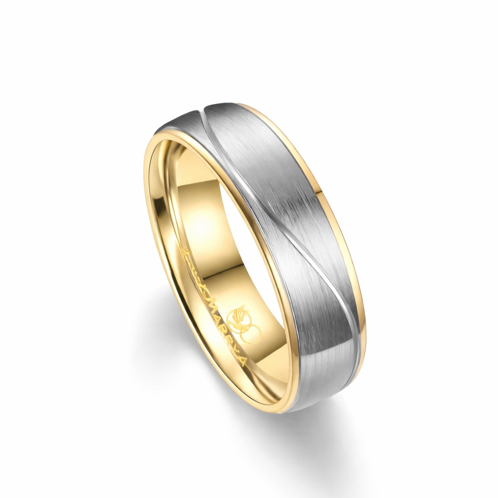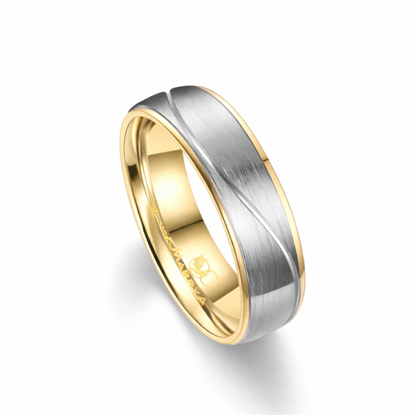 En 6,5 mm vielsesring, med en silkemat overflade med blankt mønster og 14 kt IP forgyldt inderring, hvor kanter kan ses