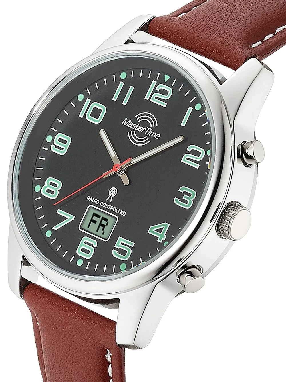 Dette Master Time-ur kombinerer præcis tidtagning med praktisk anvendelighed. Den automatiske radiosynkronisering sikrer, at du altid har den korrekte tid - uden manuel justering. Med en 41 mm urskive og brun læderrem passer uret til hverdagens udfordringer.