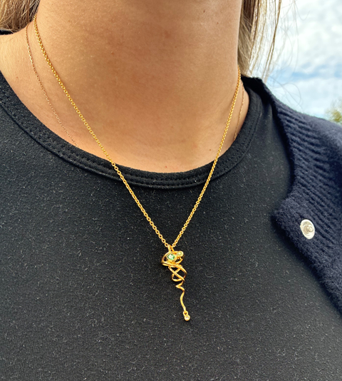 Abstrakt spiral vedhæng i forgyldt sterling sølv med grøn 4x3 mm kvarts og 2 mm peridot, samt smuk hvid topas på 1,5 mm.