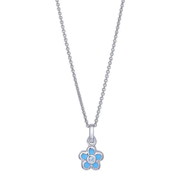 Blomstret vedhæng med lyseblå emalje og klar sten på enkel kæde.