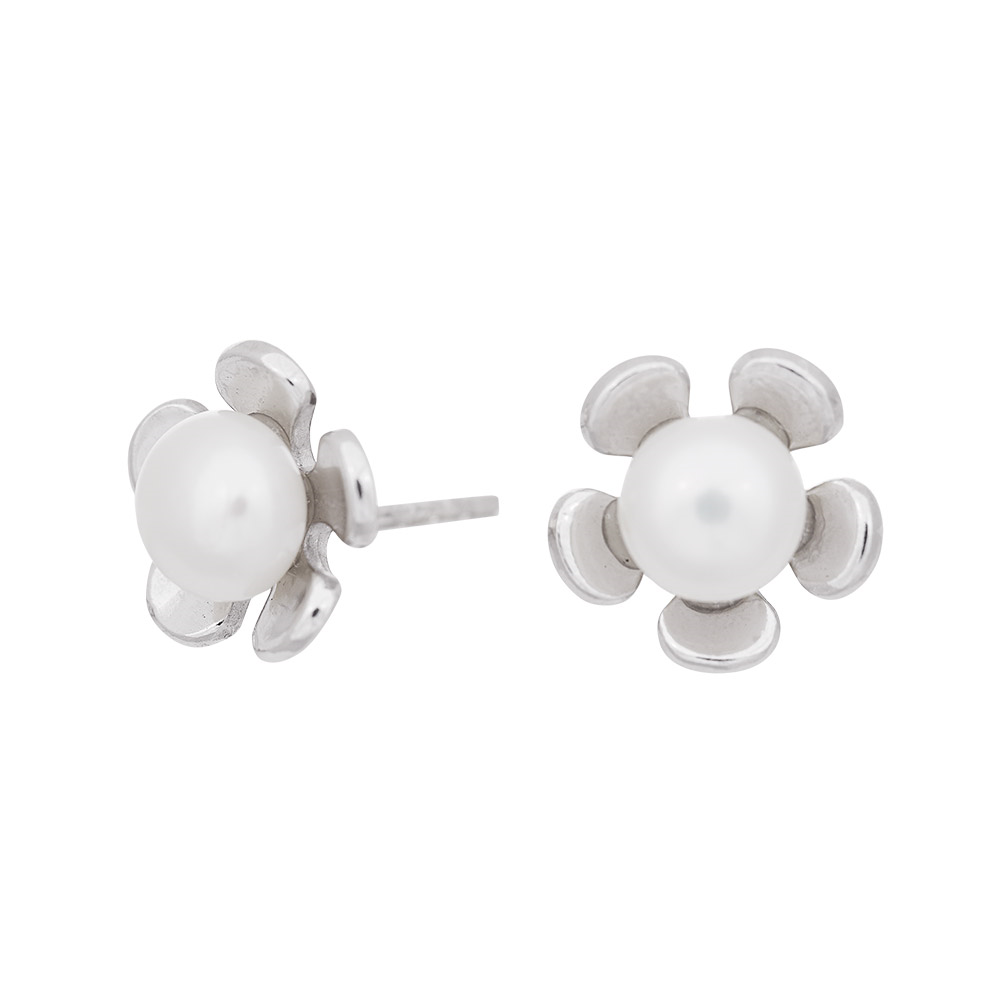 Rhod. sølv ørestikker blomst m/ perle, fra Siersbøl