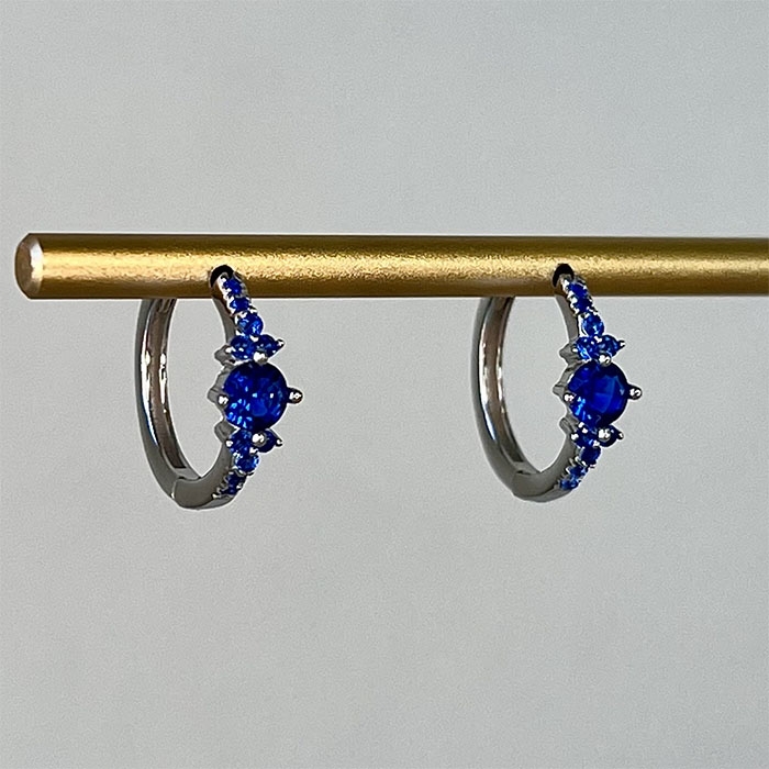 To sølvfarvede creoler med blå zirkonia hænger på en gylden stang.