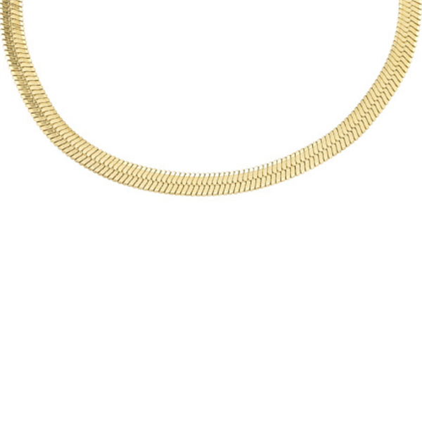 Bredt slangehalskæde i stål, belagt med 14 karat guld, et smukt og klassisk design. Halskæden er 5 mm bred og længden er 42 cm + 3 cm forlænger. Vandfast med unik holdbarhed.