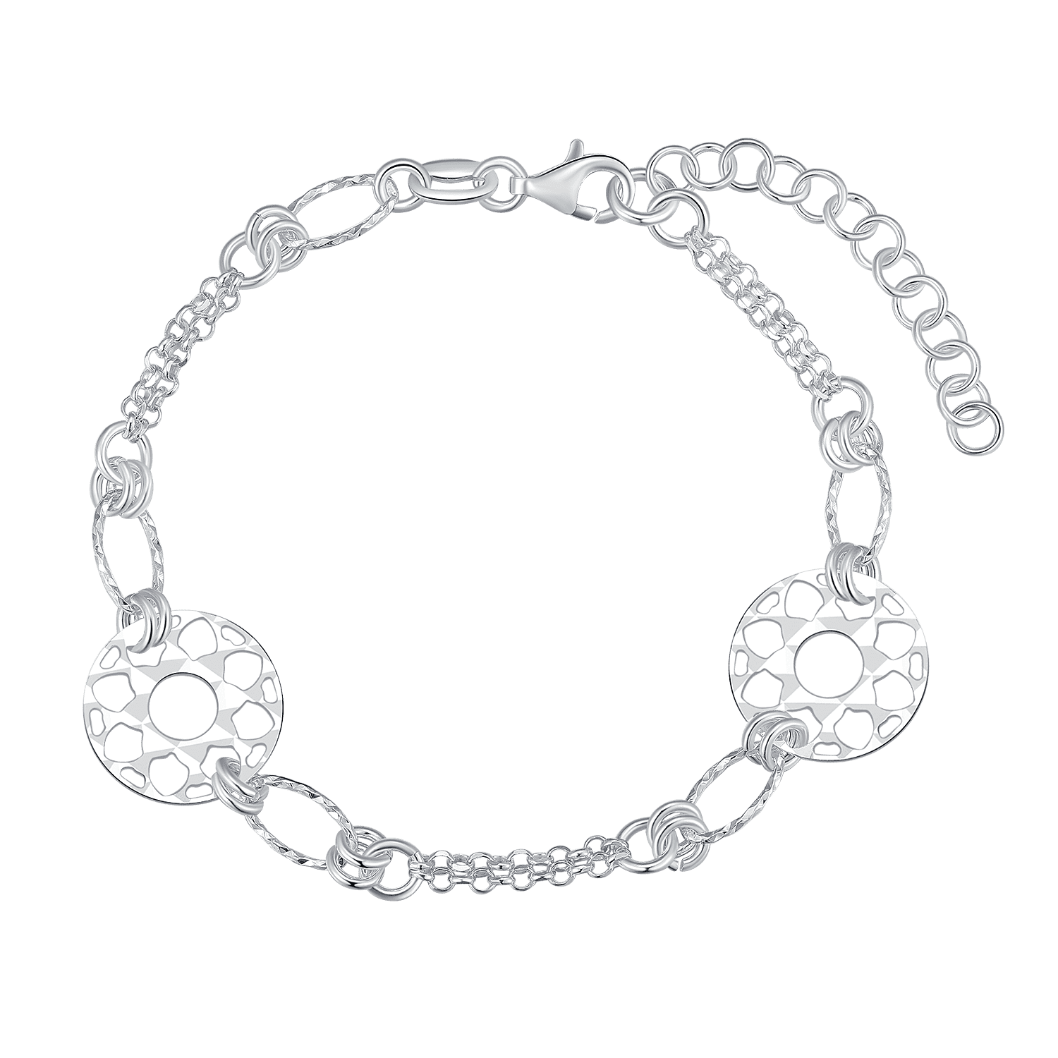 Sølv armbånd 2 facetteret blomster med 5 ovale ringe 17+4 cm.