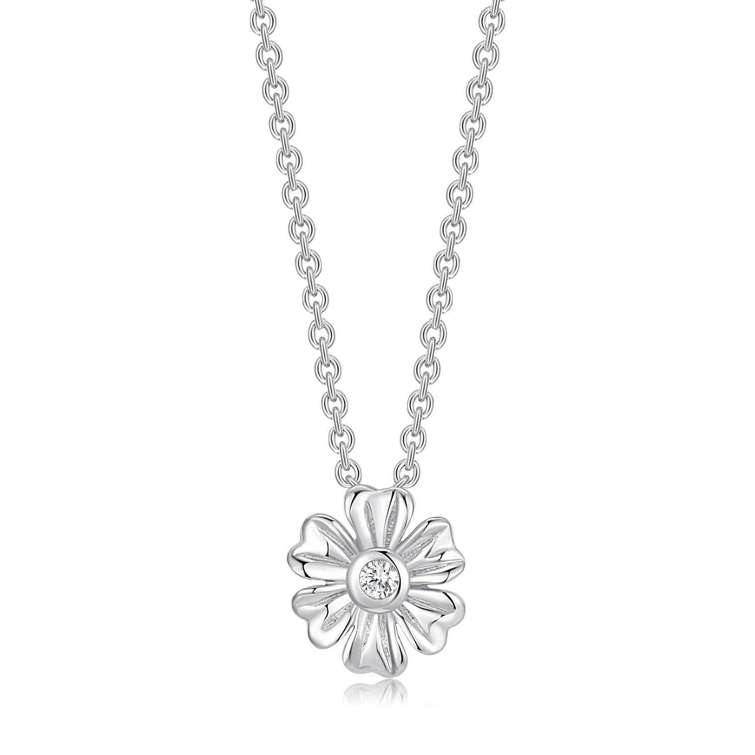 Sølv halskæde rhodineret blomst med syntetisk cubic zirconia i midten.