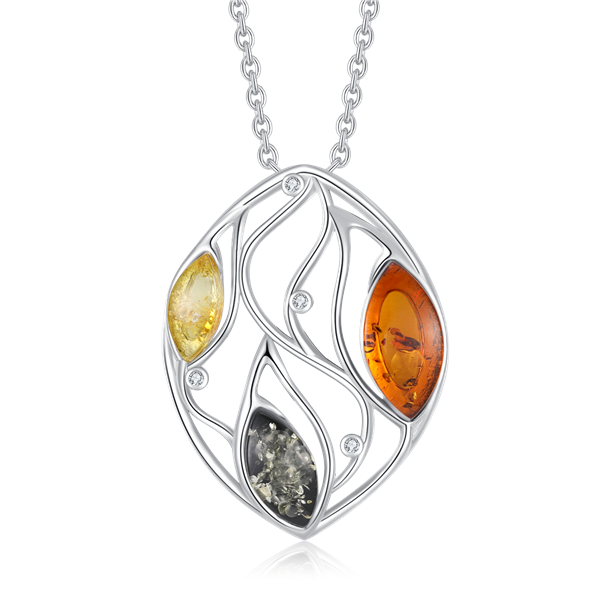 Sølv halskæde rhodineret dråbe med 3 forskellige rav - Lemon, rav, sort agat og syntetiske cubic zirconia.