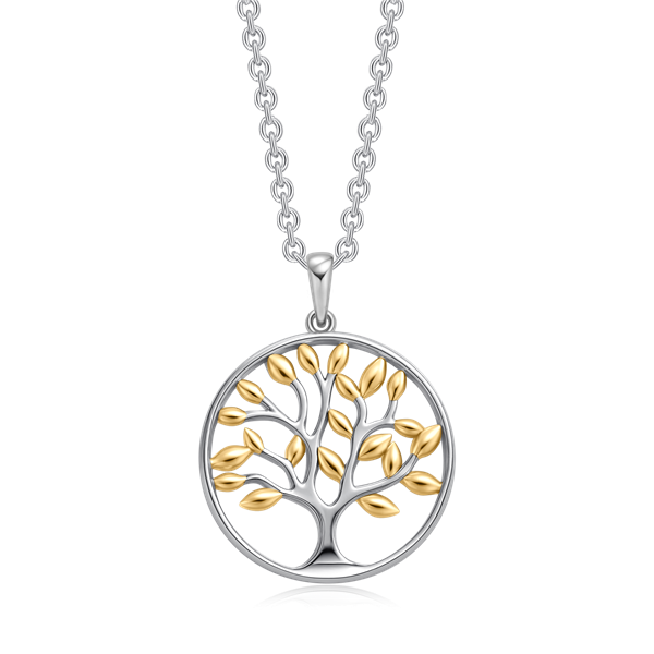 Sølv halskæde med rundt vedhæng, trædesign og gyldne blade. Kæde af sammenkoblede led.