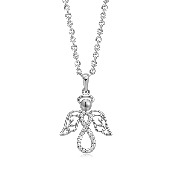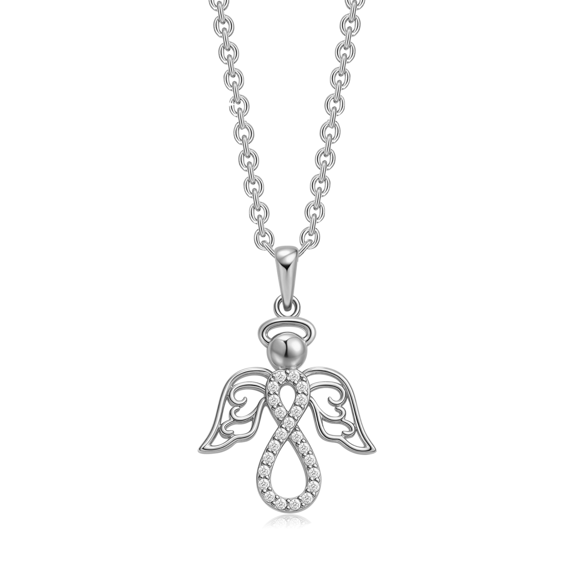 Sølvhalskæde med englevedhæng, pyntet med glimtende sten og kæde med runde led.