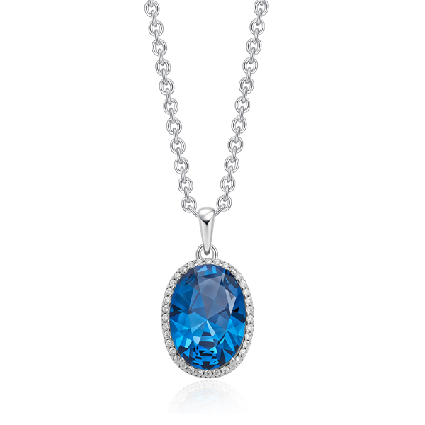 Sølv halskæde rhodineret oval med syntetisk london blå topas og syntetiske cubic zirconia rundt om.