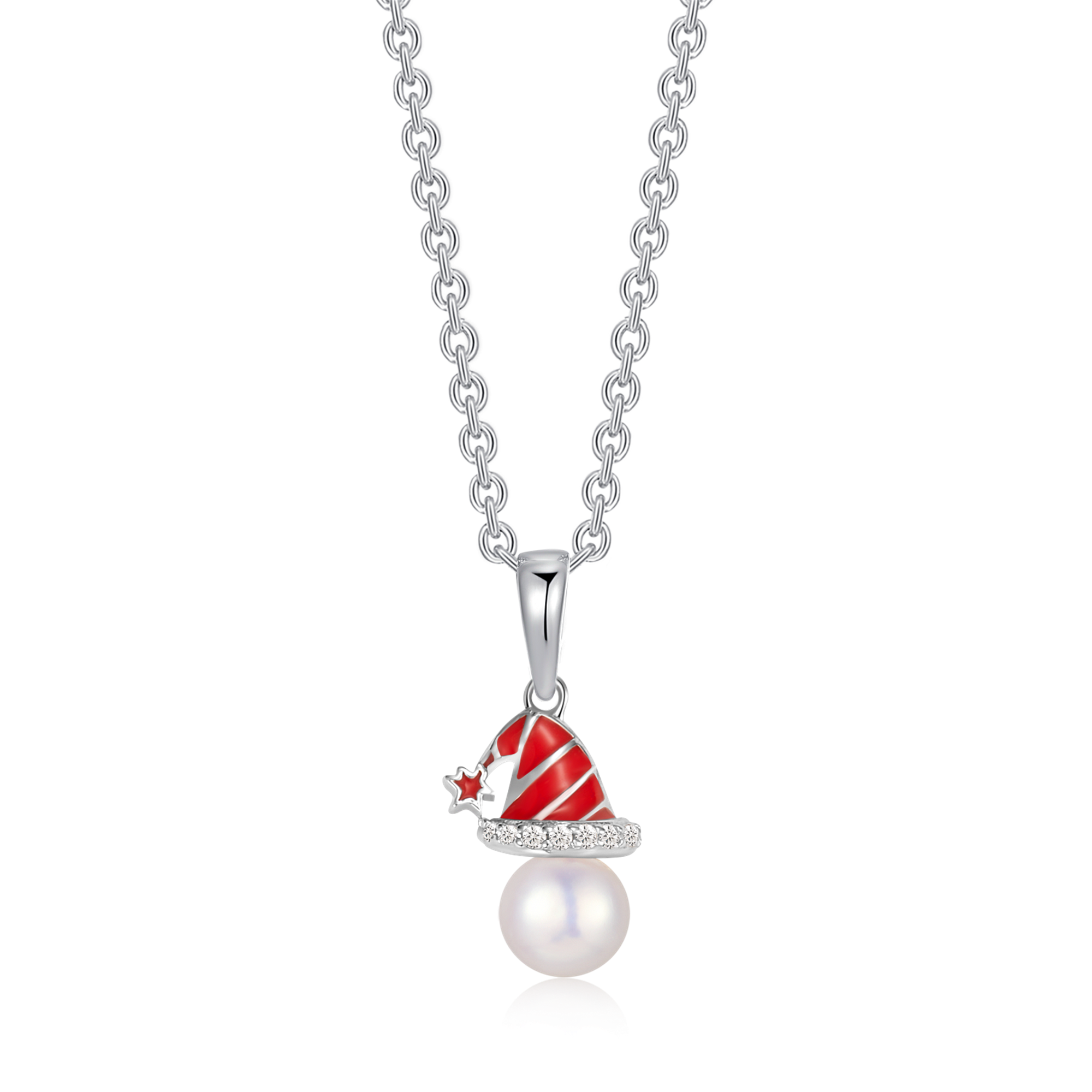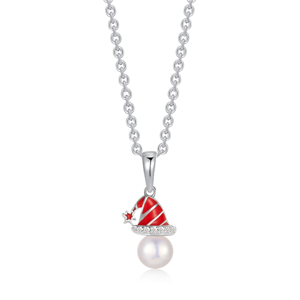 Sølv halskæde rhodineret rød blyfri emalje julehue med ferskvandsperle og syntetiske cubic zirconia.