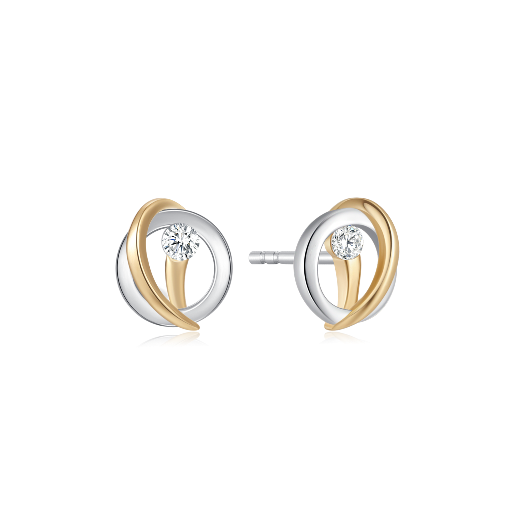 Sølv- og guldfarvede ørestikker med klar sten i midten, indviklede løkker, elegant design.