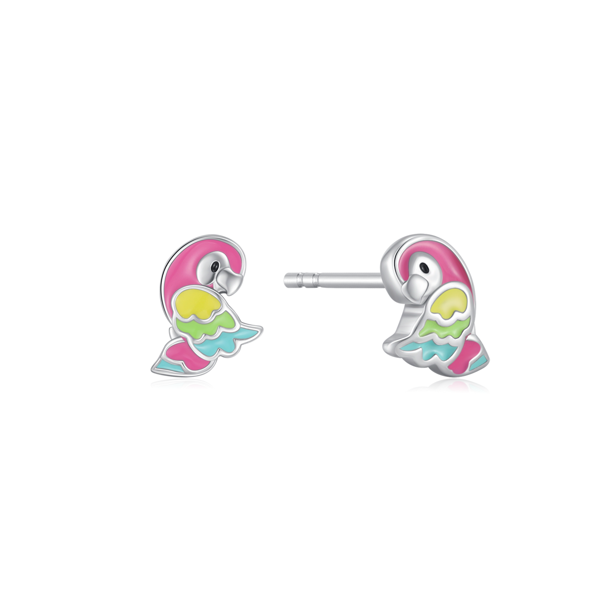 Sølv ørestikker formet som papegøjer med lyserød, gul, blå og grøn emalje.