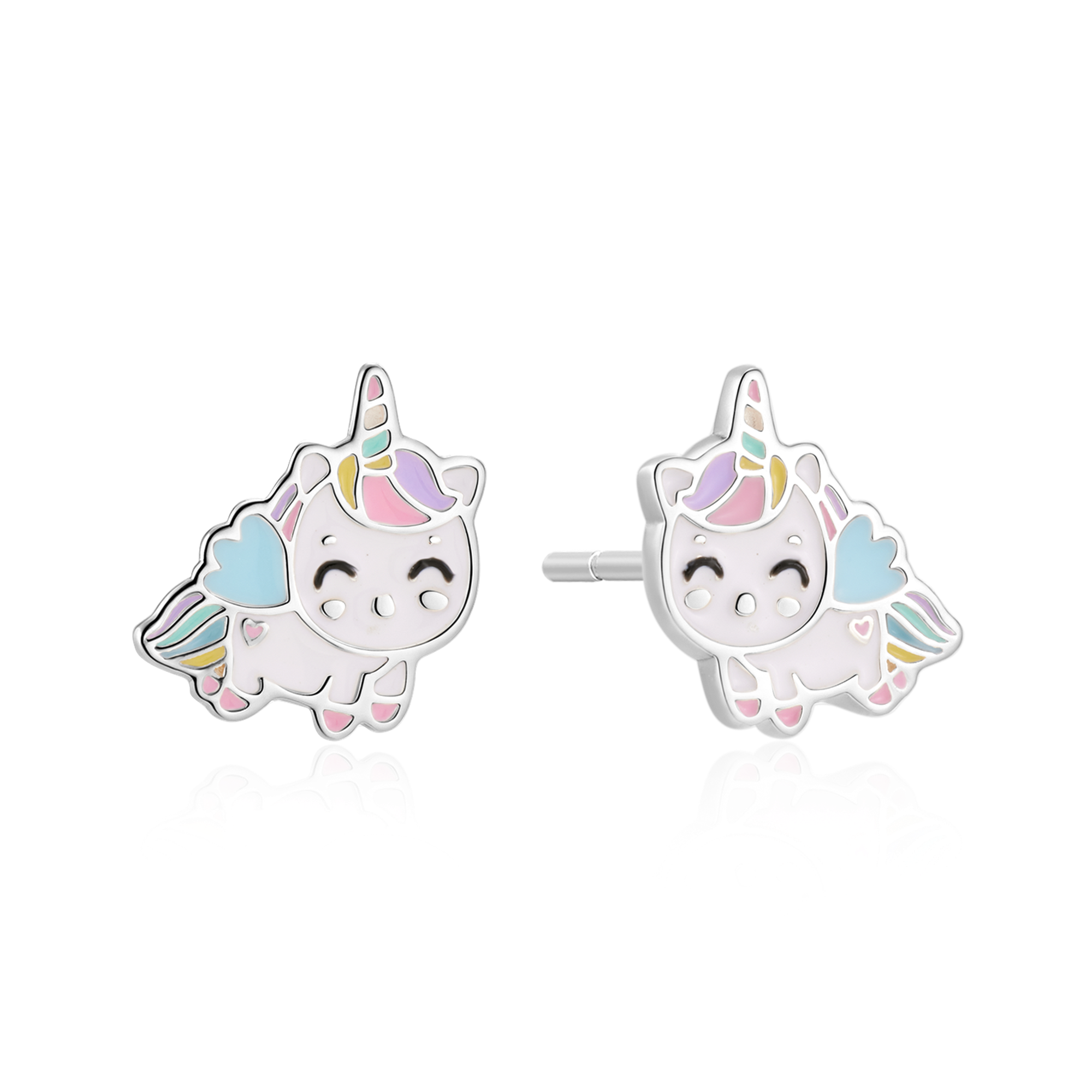 Sølv ørestikker formet som smilende unicorns med pastelfarver og vinger.