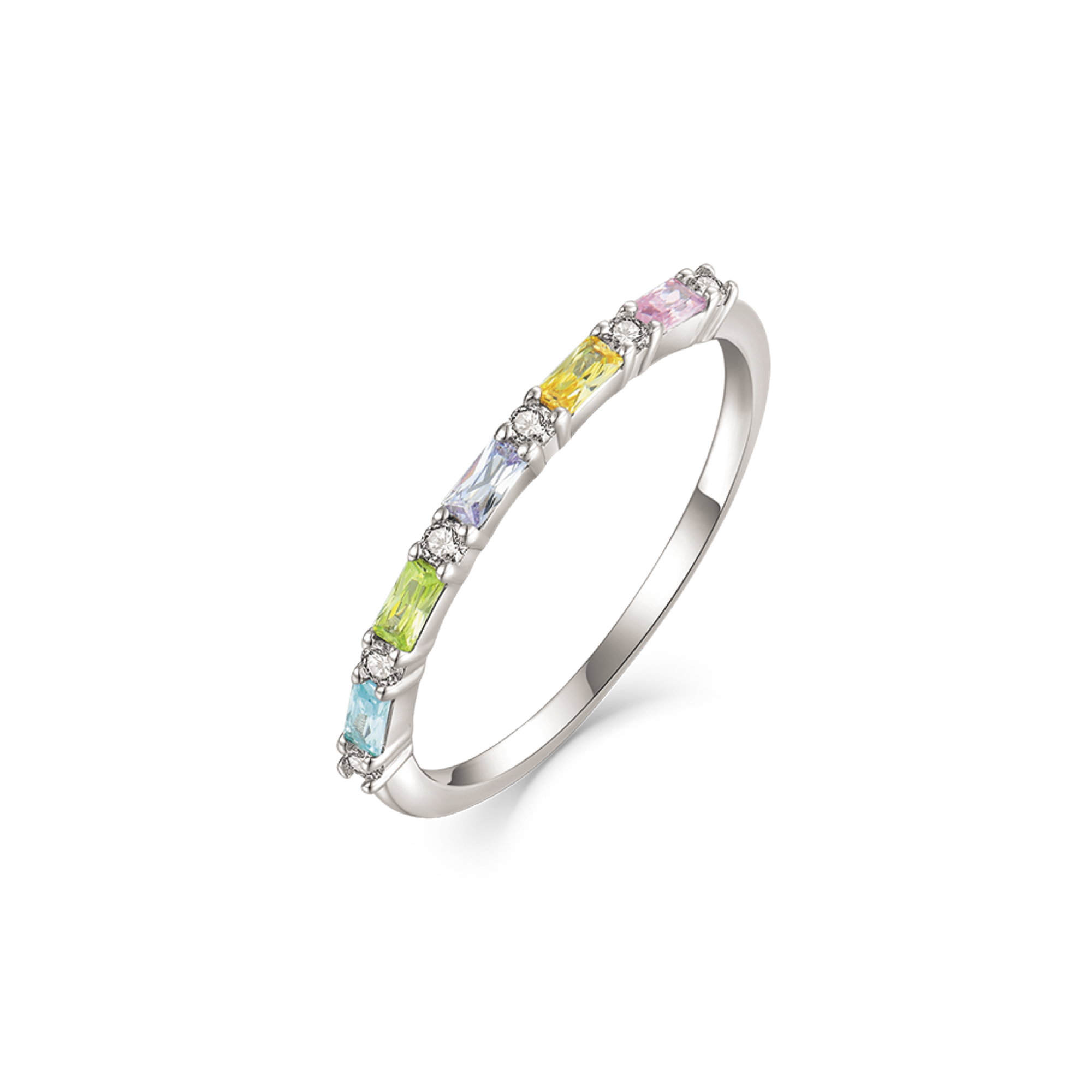 Sølvfarvet ring med rektangulære blå, grønne, gule, lyserøde sten og klare sten imellem.