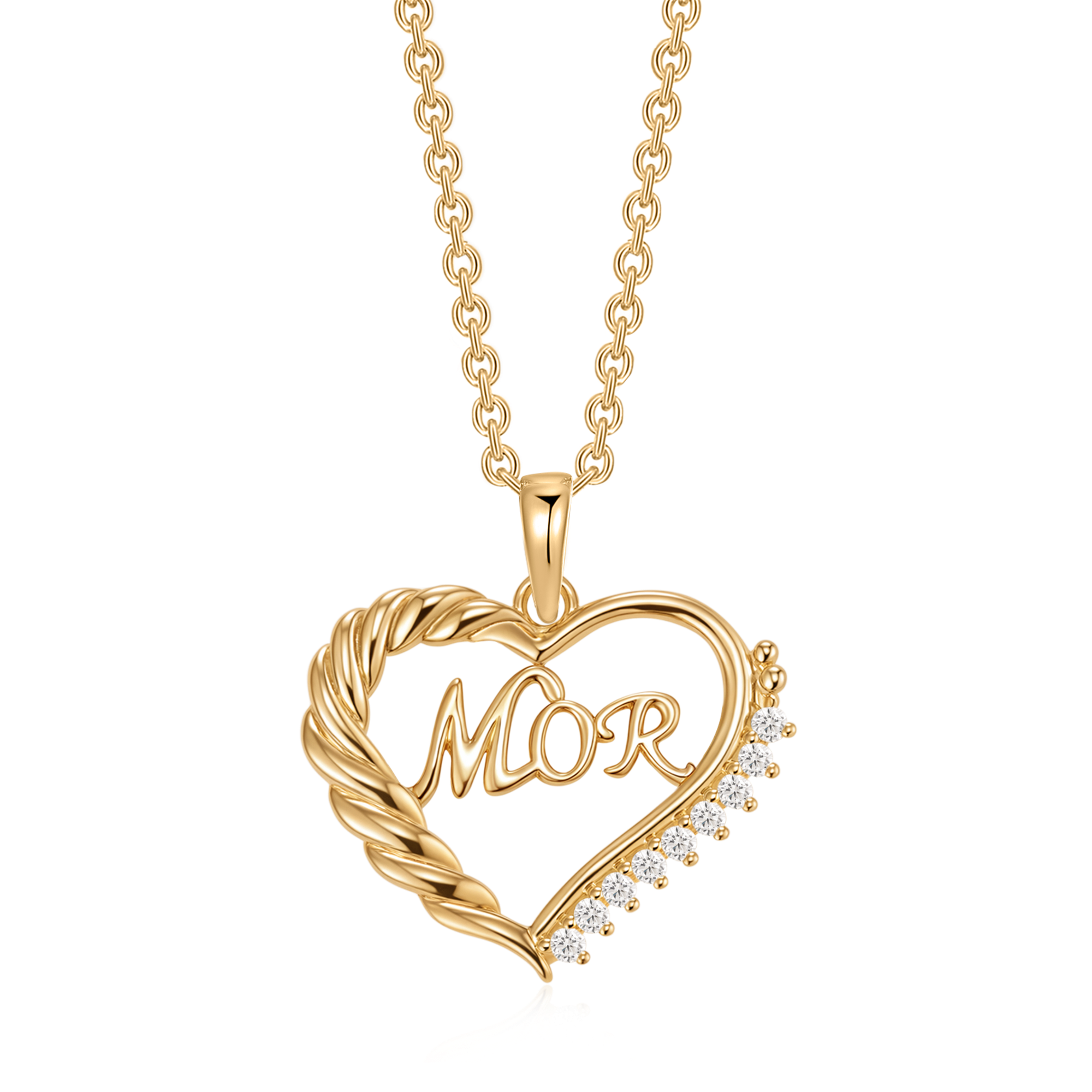 Sølvforgyldt halskæde hjerte med tekst MOR og syntetiske cubic zirconia i den højre side af kant.