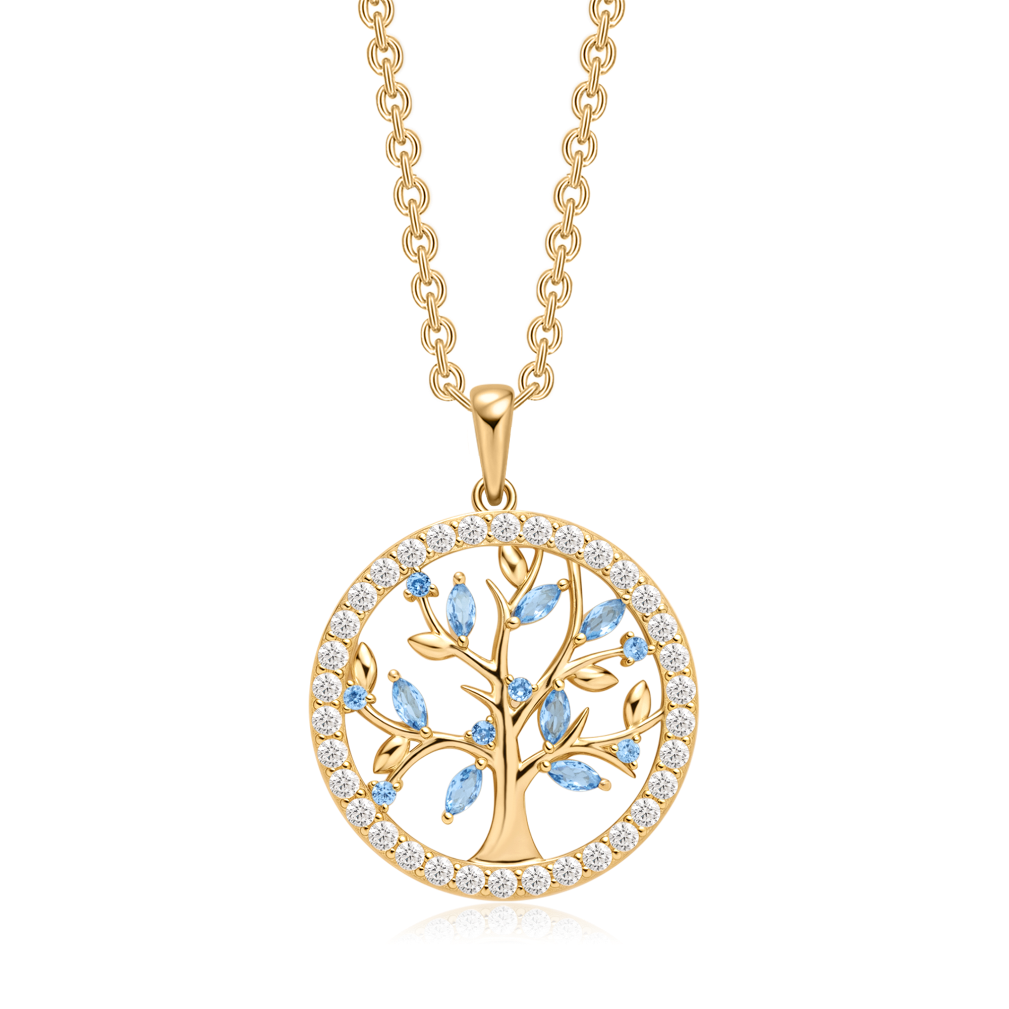 Sølvforgyldt halskæde med rundt vedhæng, træmotiv, blå og klare sten fra Støvring Design.