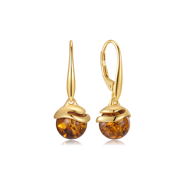 Sølvforgyldt ørehængere rund kugle i rav.