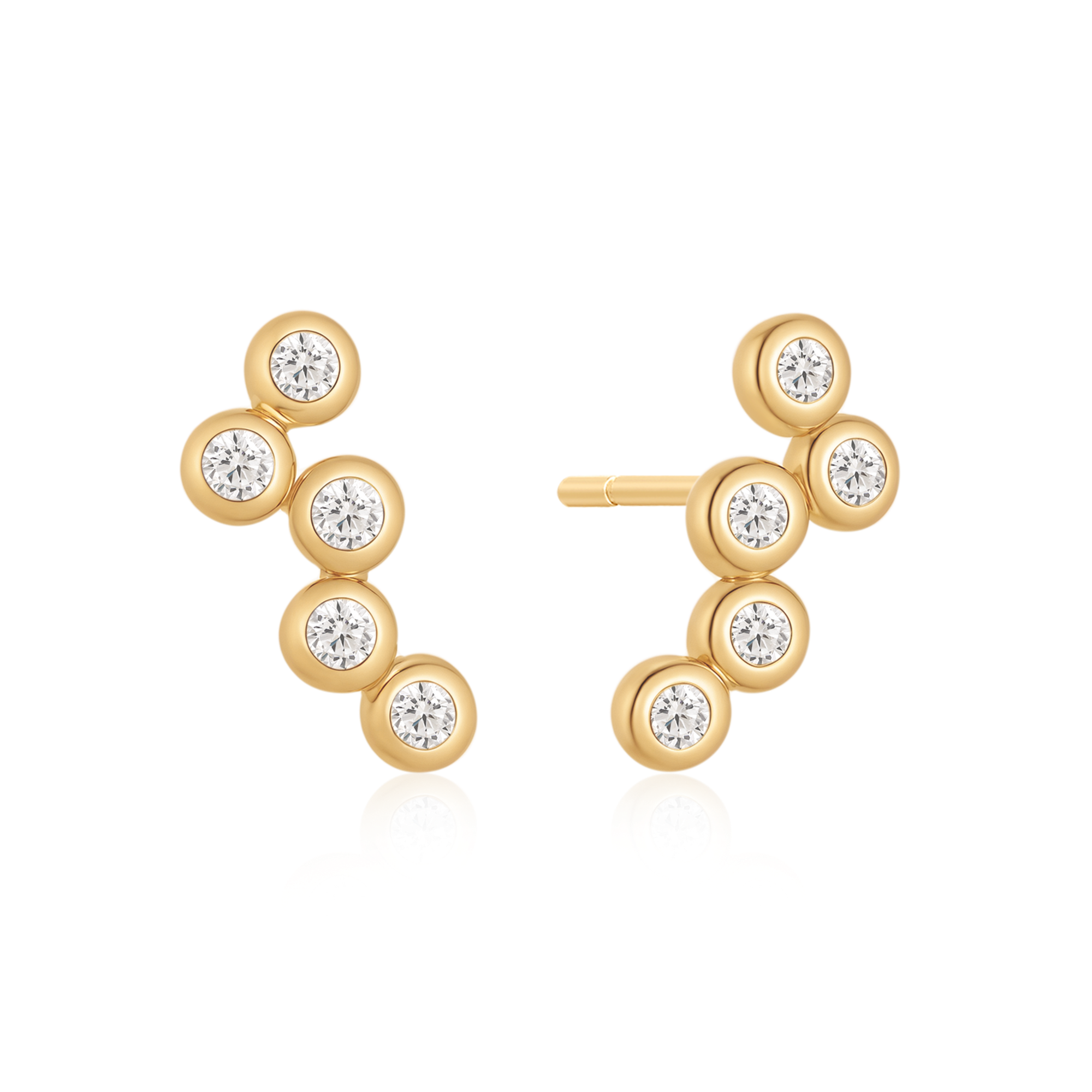 Sølvforgyldt ørestikker med fem gyldne cirkler i kurvet linje, hver med en klar sten i midten.