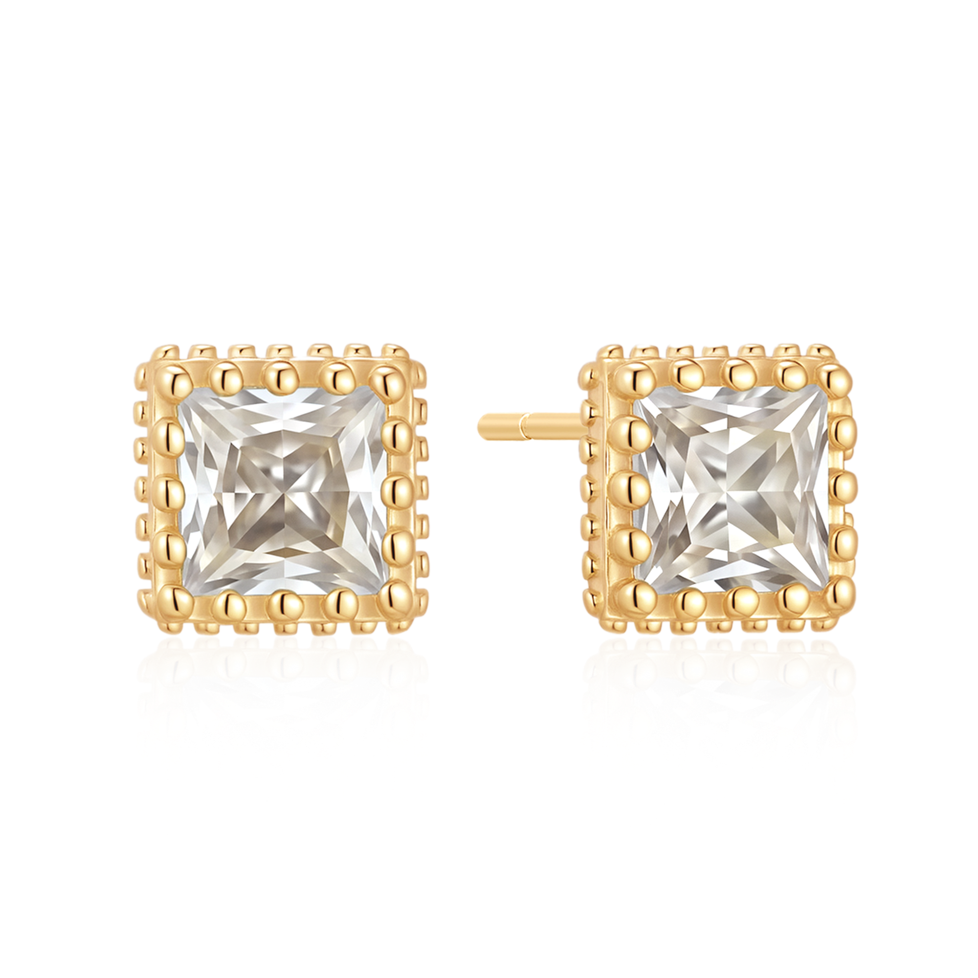 Sølvforgyldt ørestikker firkant med syntetisk cubic zirconia og små prikker i kanten..