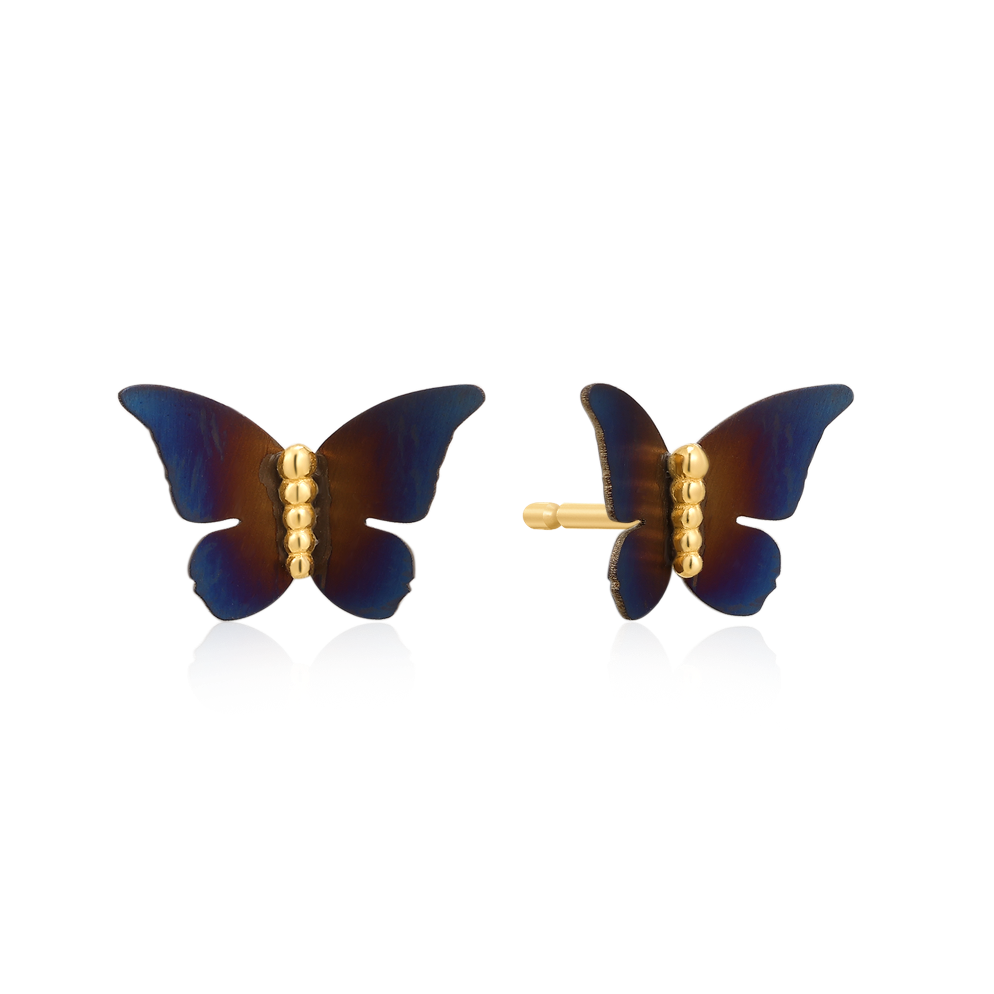 Sommerfugleformede ørestikker med gradient fra mørkeblå til brun og gyldne kugler i midten.