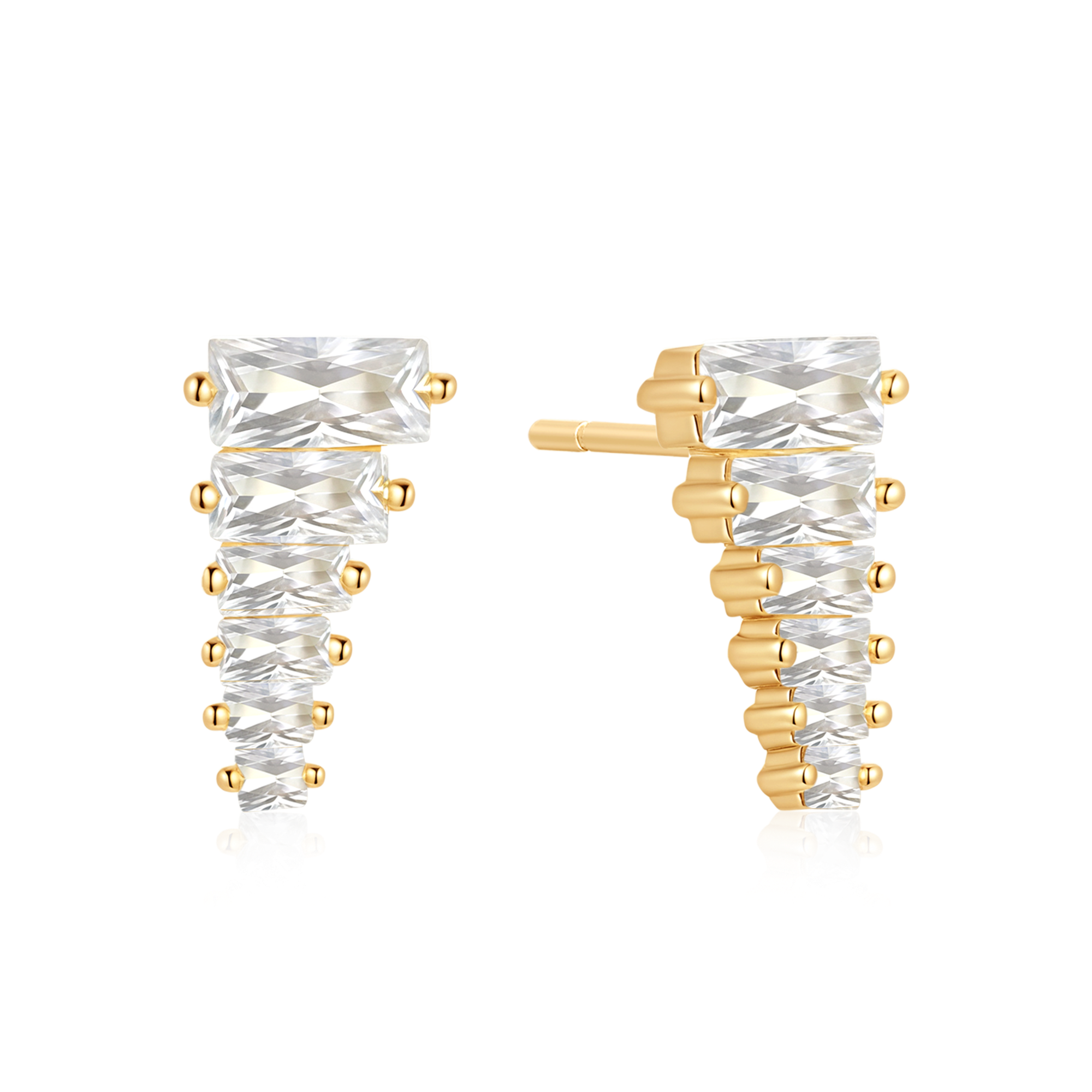 Sølvforgyldte ørestikker med klare sten i guldfarvet indstilling, graduerende størrelse.