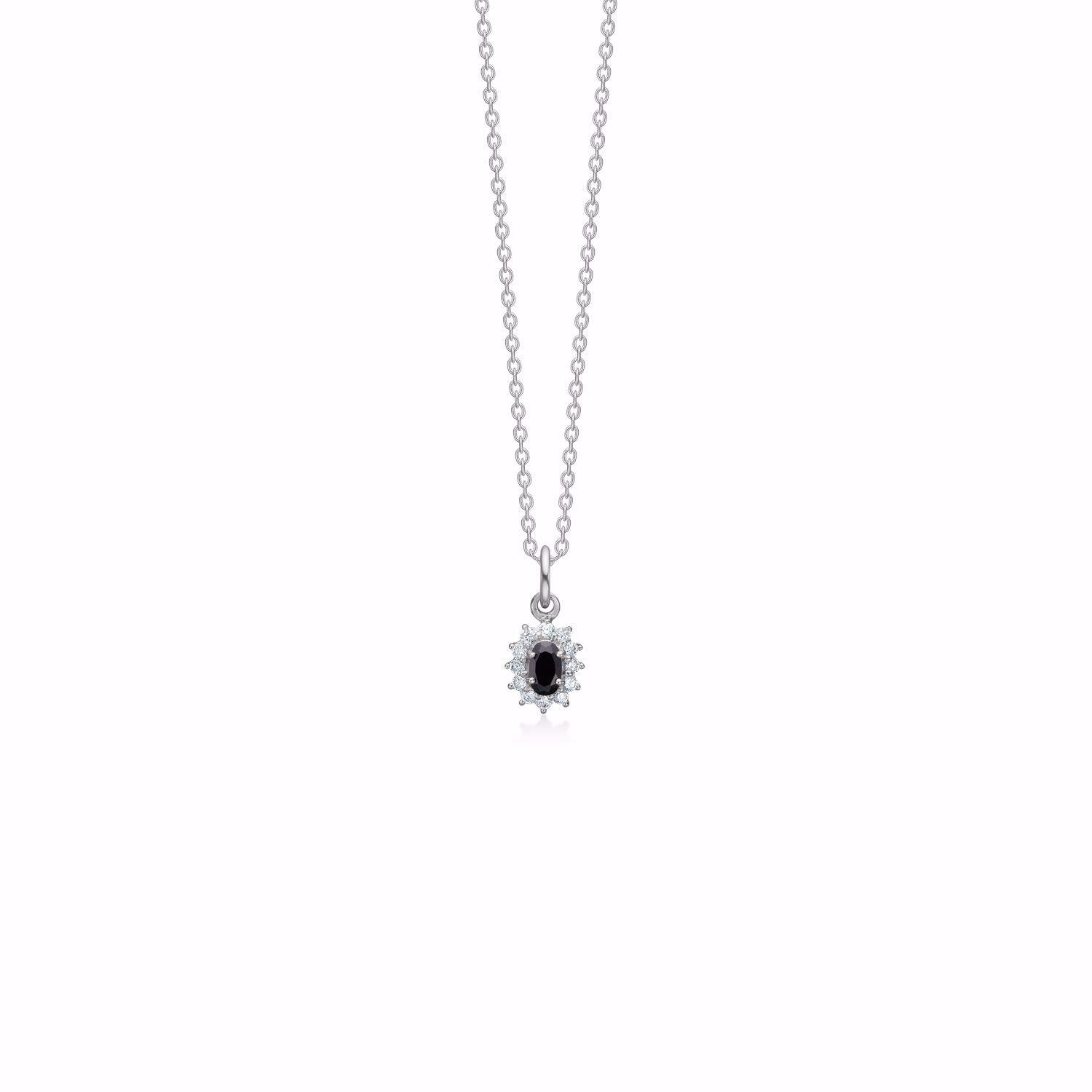 Sølvvedhæng med central sort sten omgivet af klare sten i rosetform, på en fin kæde.