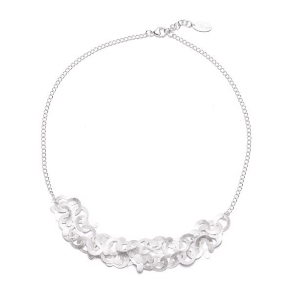 Halskæde i børstet sølv med dekorative cirkler, justerbar kæde og lukning.