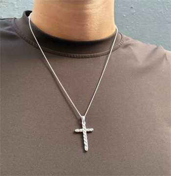 Dette elegante korsvedhæng i sterlingsølv (925) er en moderne fortolkning af det klassiske korsdesign. Med sine dimensioner på 28 x 19 mm og en karakteristisk snoet overflade, skiller dette vedhæng sig ud med sin unikke struktur og fine detaljer. Det snoede mønster symboliserer styrke og sammenhæng – en smuk metafor for tro og livets bånd.
