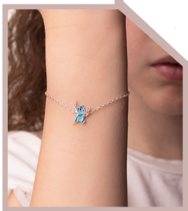 Disney har skabt et armbånd, der kombinerer klassisk design med moderne detaljer.  Den fine sølvkæde med hjerte og Stitch-charm giver et distinkt udseende, der passer til enhver anledning.