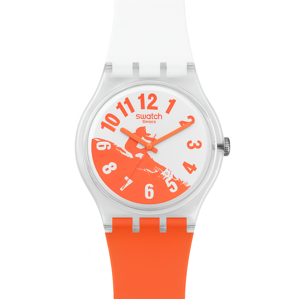 To farvet ur i orange og hvidt med surf design. Leveres i sjovt penalhus.
