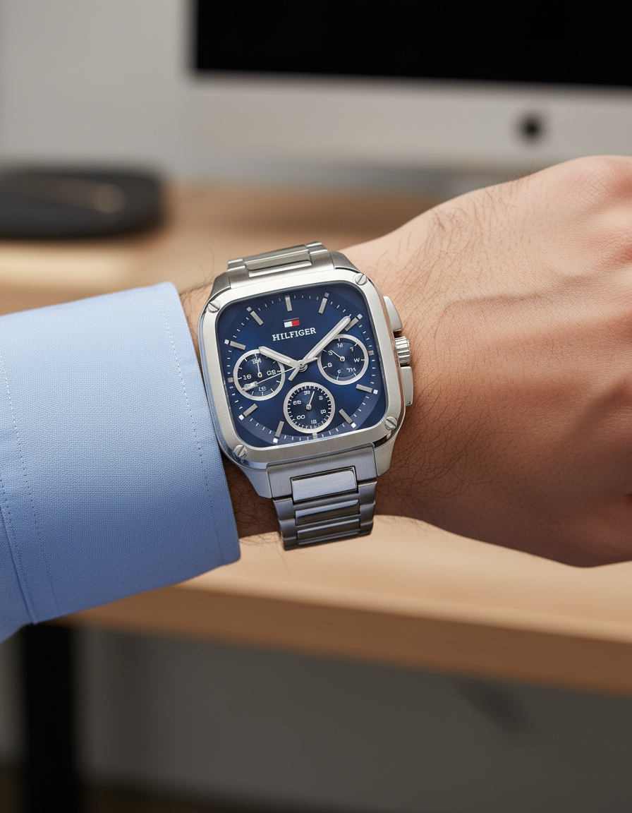Tommy Hilfiger ur med blå rektangulær urskive, tre sub-dials og metalrem.