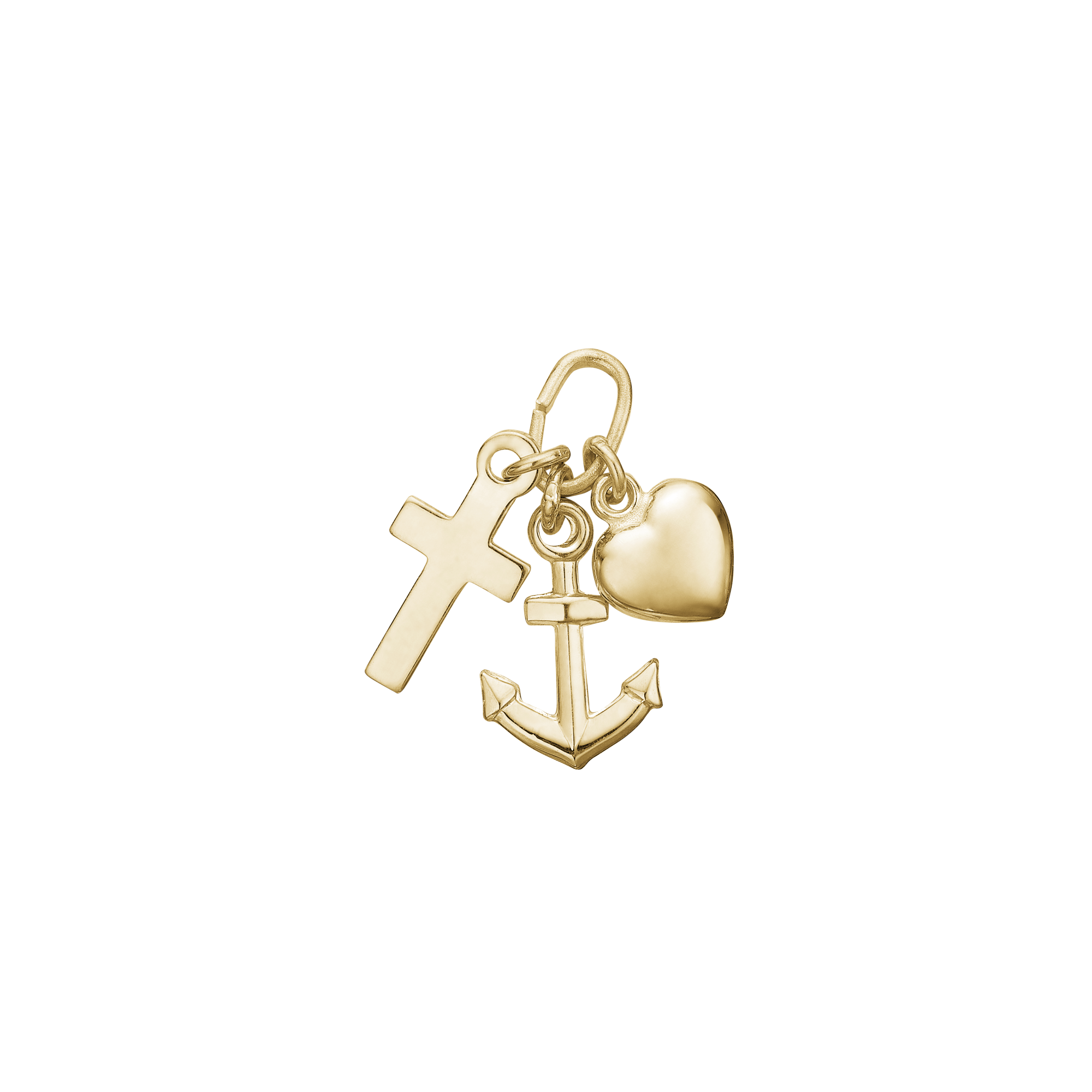 Guldvedhæng med tre charms: kors, anker og hjerte, alle hænger fra samme løkke.