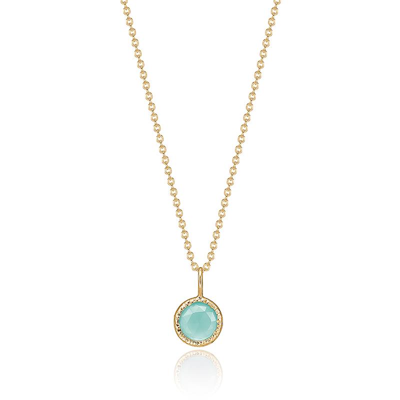 Smukt vedhæng i guldbelagt sølv med aqua calcedon. Et enkelt og feminint smykke. Aqua Calcedon: Venskabssten skaber balance i krop og sjæl. Bringer harmoni og glæde i nære relationer og påvirker din empati og indlevelsesevne.