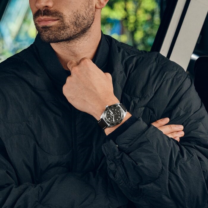 Med dag/dato-funktion holder du let styr på tiden under lange vandreture og rejser. Den sorte urskive med tydelige tal og markeringer gør det nemt at aflæse tiden under dårlige lysforhold, mens den sorte læderrem fuldender det professionelle udtryk.